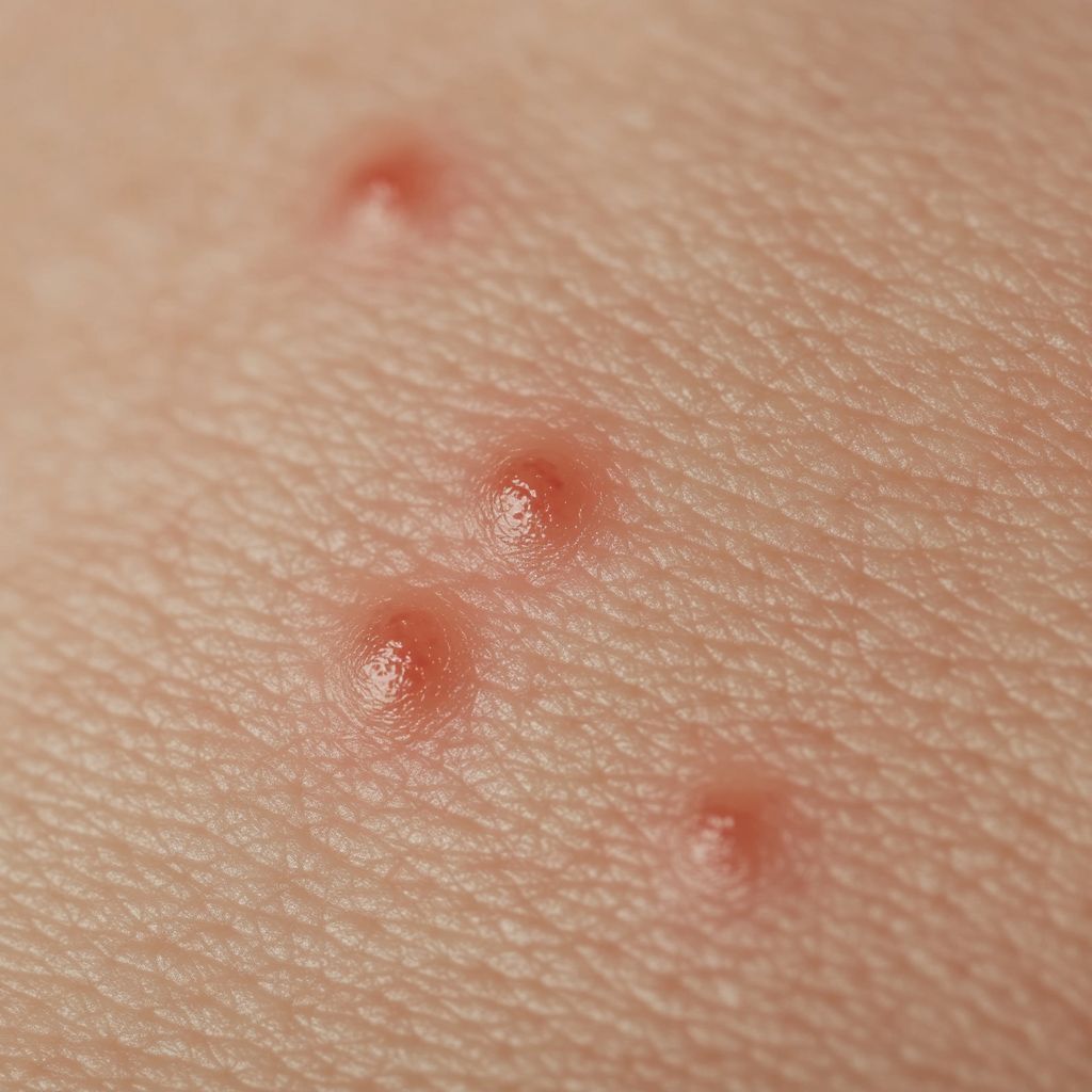 Piqûre de puce : Les puces piquent souvent en groupe ou en ligne, principalement sur les jambes, les chevilles et les pieds. Les piqûres sont petites, rouges et provoquent des démangeaisons intenses. Elles peuvent entraîner des infections secondaires si elles sont grattées.