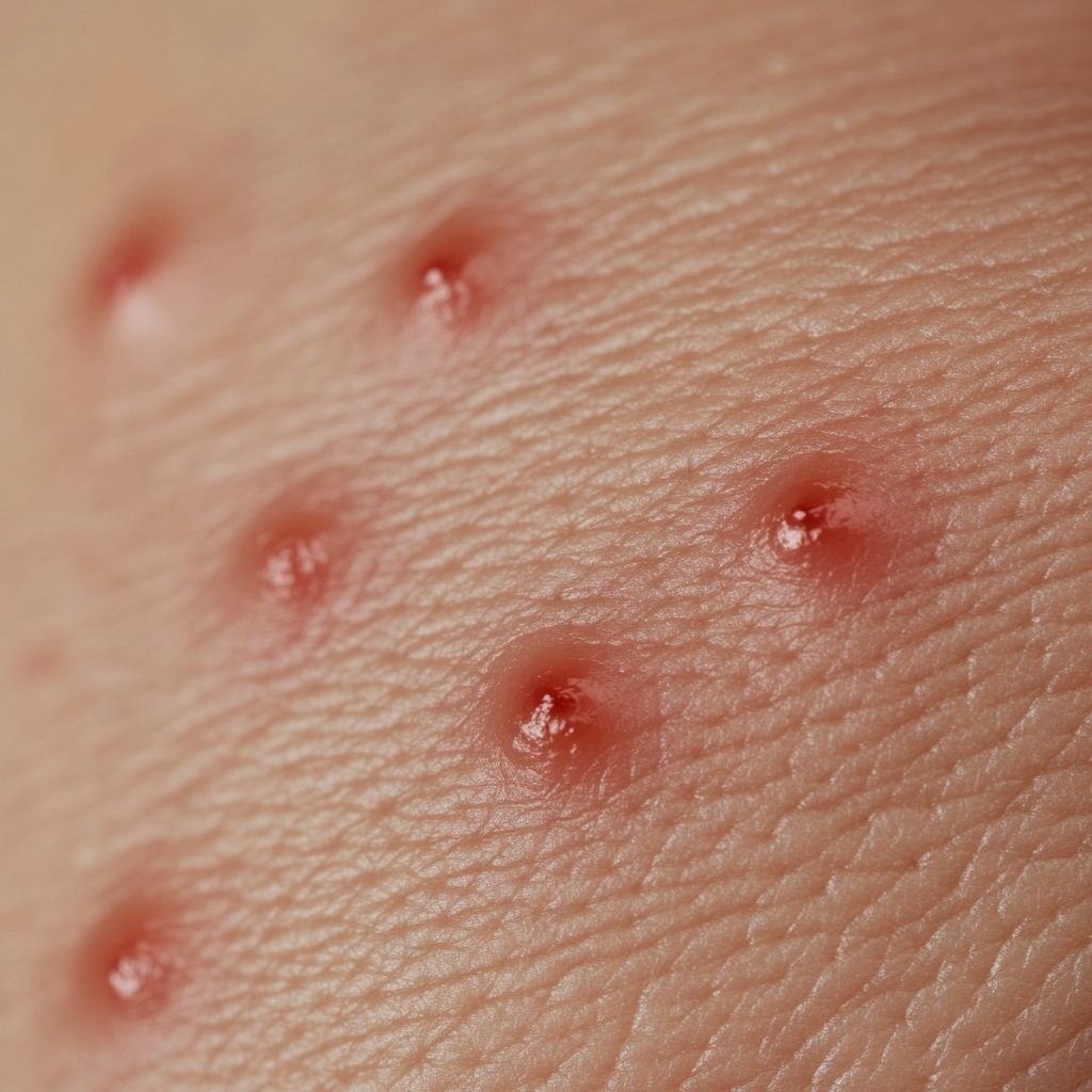 Piqûre de puce : Les puces piquent souvent en groupe ou en ligne, principalement sur les jambes, les chevilles et les pieds. Les piqûres sont petites, rouges et provoquent des démangeaisons intenses. Elles peuvent entraîner des infections secondaires si elles sont grattées.
