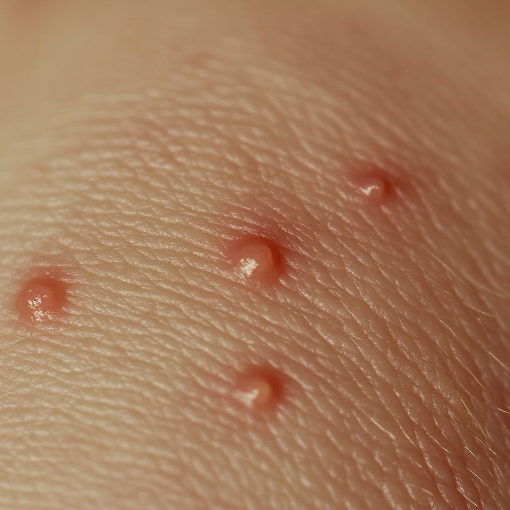 Piqûre de puce : Les puces piquent souvent en groupe ou en ligne, principalement sur les jambes, les chevilles et les pieds. Les piqûres sont petites, rouges et provoquent des démangeaisons intenses. Elles peuvent entraîner des infections secondaires si elles sont grattées.