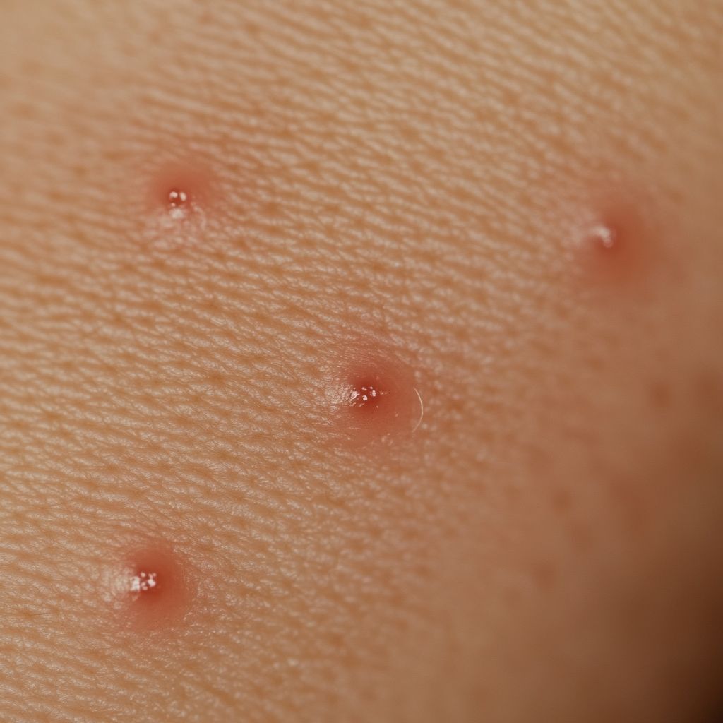 Piqûre de puce : Les puces piquent souvent en groupe ou en ligne, principalement sur les jambes, les chevilles et les pieds. Les piqûres sont petites, rouges et provoquent des démangeaisons intenses. Elles peuvent entraîner des infections secondaires si elles sont grattées.