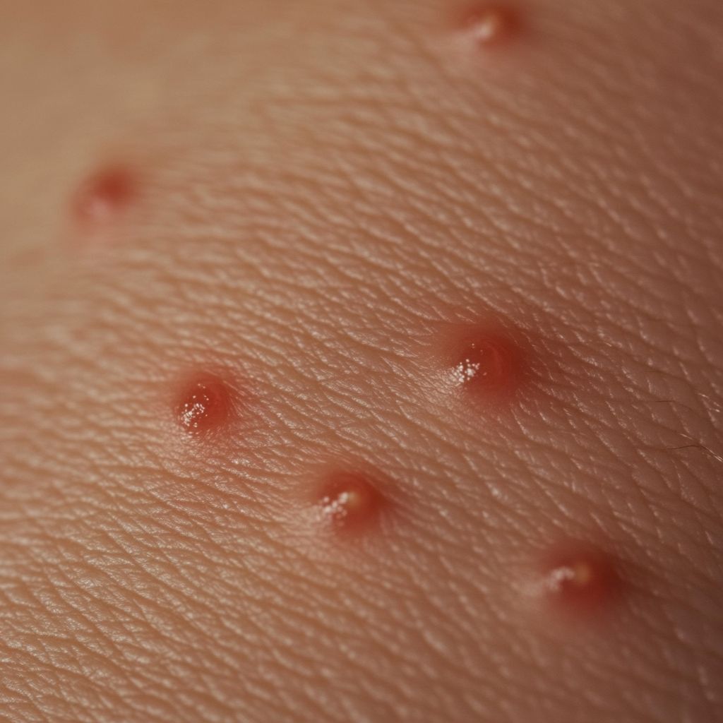 Piqûre de puce : Les puces piquent souvent en groupe ou en ligne, principalement sur les jambes, les chevilles et les pieds. Les piqûres sont petites, rouges et provoquent des démangeaisons intenses. Elles peuvent entraîner des infections secondaires si elles sont grattées.