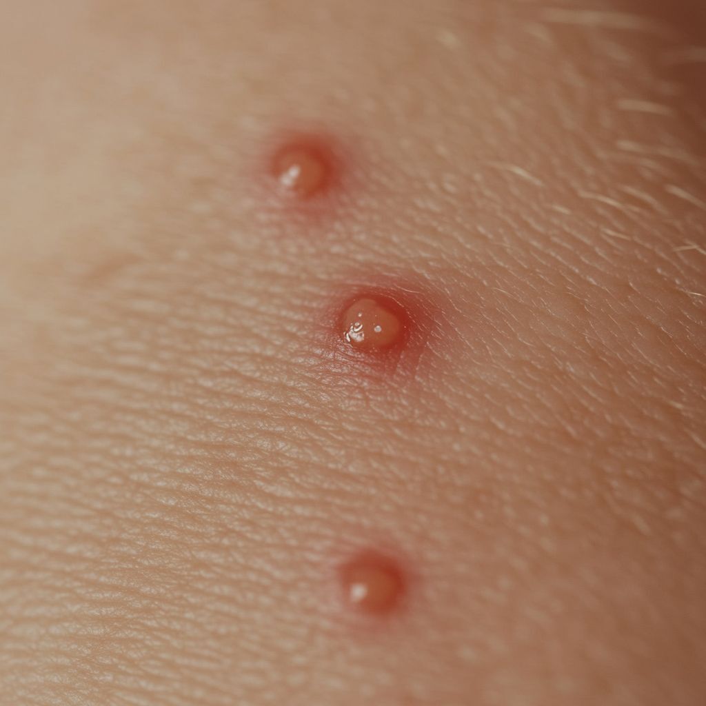 Piqûre de puce : Les puces piquent souvent en groupe ou en ligne, principalement sur les jambes, les chevilles et les pieds. Les piqûres sont petites, rouges et provoquent des démangeaisons intenses. Elles peuvent entraîner des infections secondaires si elles sont grattées.