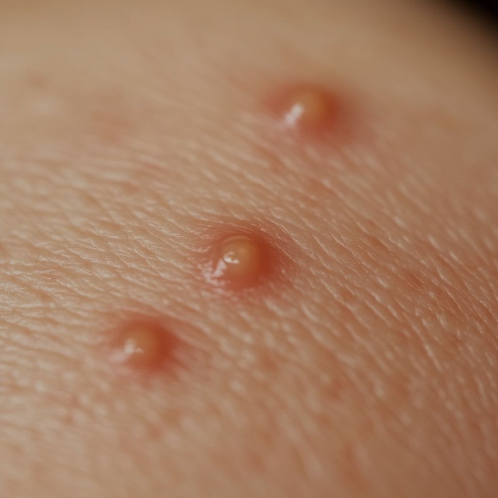 Piqûre de puce : Les puces piquent souvent en groupe ou en ligne, principalement sur les jambes, les chevilles et les pieds. Les piqûres sont petites, rouges et provoquent des démangeaisons intenses. Elles peuvent entraîner des infections secondaires si elles sont grattées.