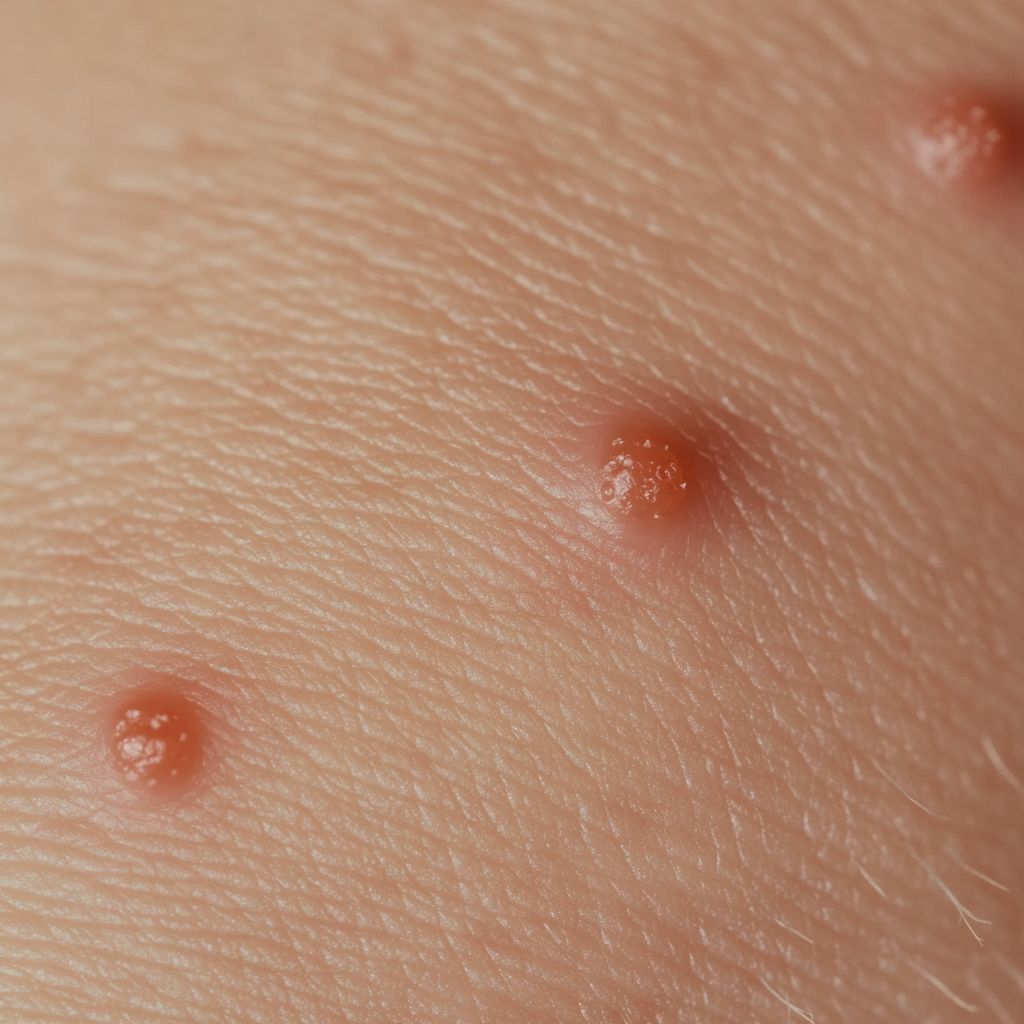 Piqûre de puce : Les puces piquent souvent en groupe ou en ligne, principalement sur les jambes, les chevilles et les pieds. Les piqûres sont petites, rouges et provoquent des démangeaisons intenses. Elles peuvent entraîner des infections secondaires si elles sont grattées.