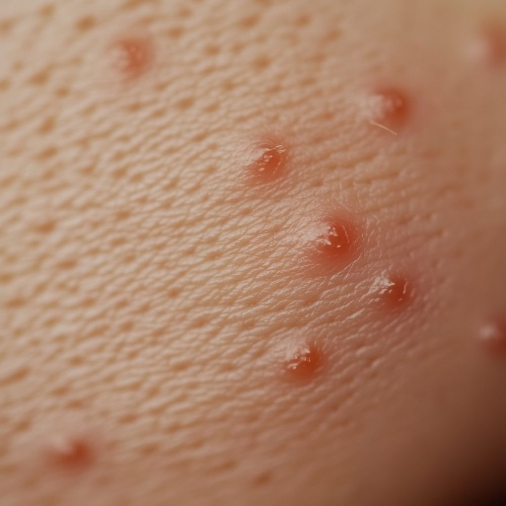 Piqûre de puce : Les puces piquent souvent en groupe ou en ligne, principalement sur les jambes, les chevilles et les pieds. Les piqûres sont petites, rouges et provoquent des démangeaisons intenses. Elles peuvent entraîner des infections secondaires si elles sont grattées.