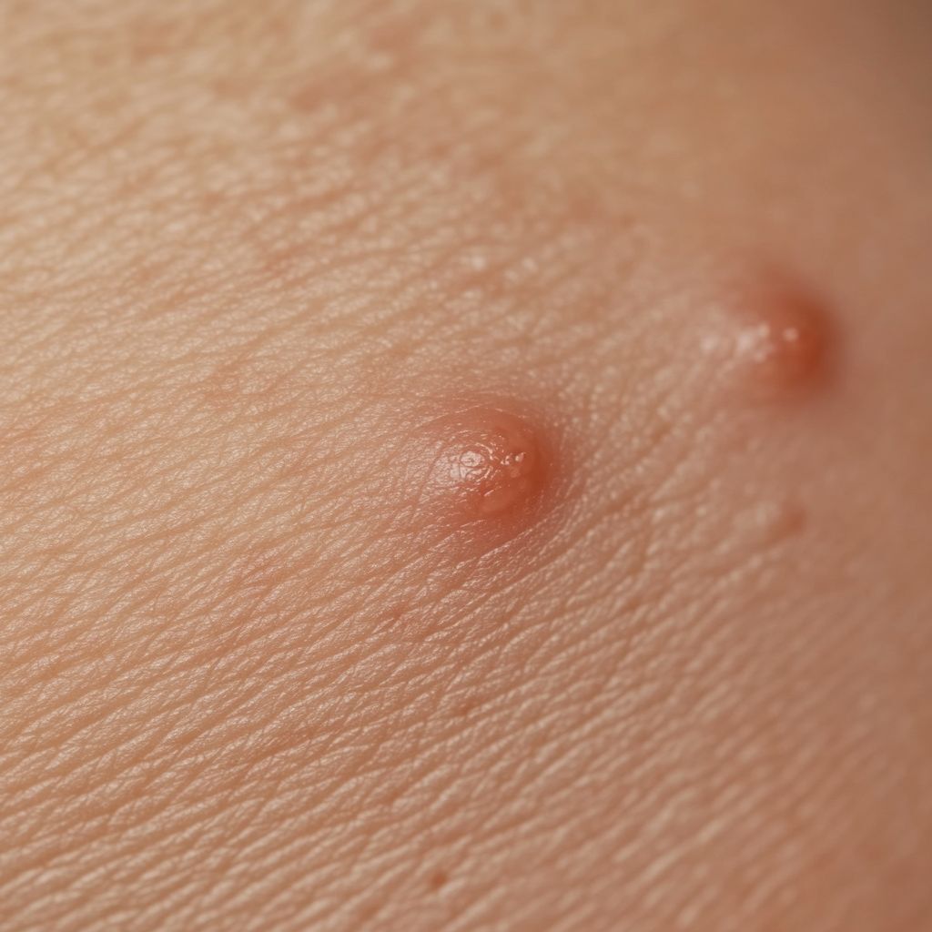Piqûre de puce : Les puces piquent souvent en groupe ou en ligne, principalement sur les jambes, les chevilles et les pieds. Les piqûres sont petites, rouges et provoquent des démangeaisons intenses. Elles peuvent entraîner des infections secondaires si elles sont grattées.