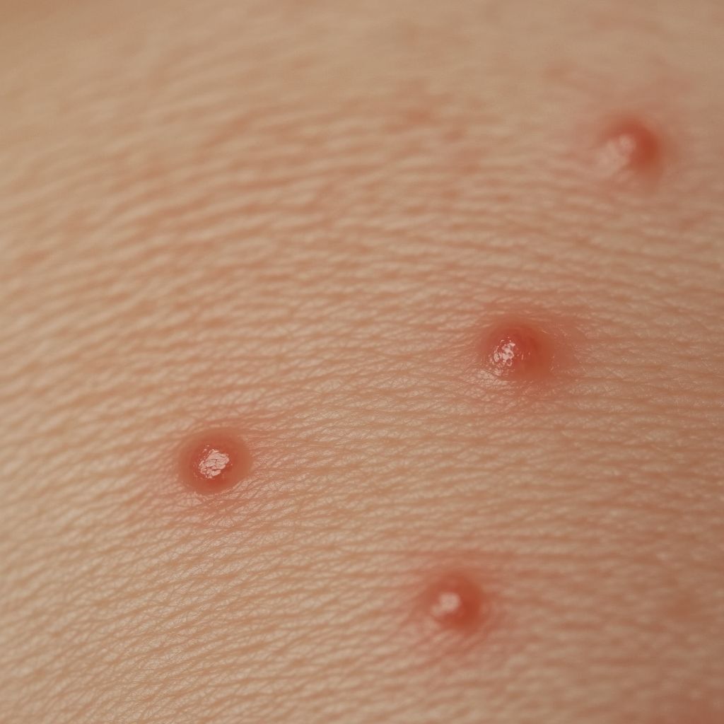 Piqûre de puce : Les puces piquent souvent en groupe ou en ligne, principalement sur les jambes, les chevilles et les pieds. Les piqûres sont petites, rouges et provoquent des démangeaisons intenses. Elles peuvent entraîner des infections secondaires si elles sont grattées.