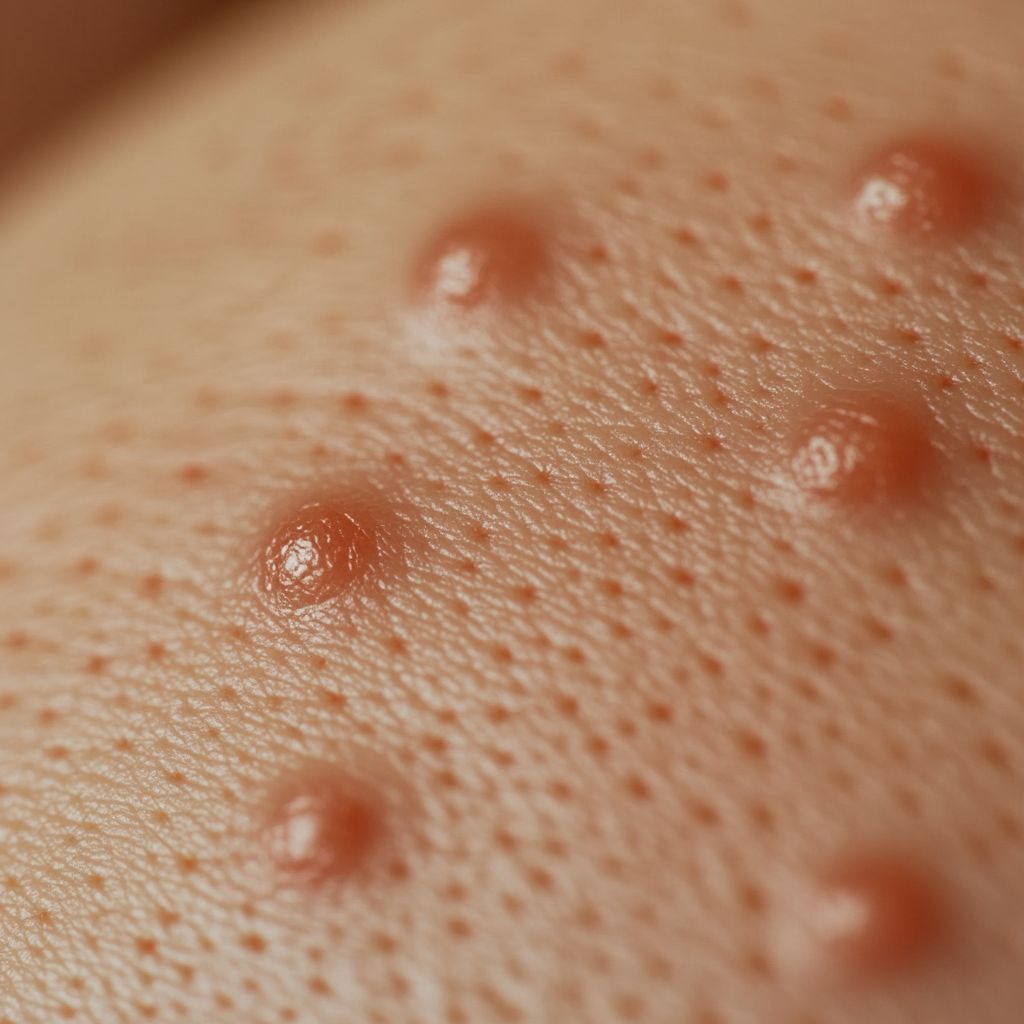 Piqûre de puce : Les puces piquent souvent en groupe ou en ligne, principalement sur les jambes, les chevilles et les pieds. Les piqûres sont petites, rouges et provoquent des démangeaisons intenses. Elles peuvent entraîner des infections secondaires si elles sont grattées.