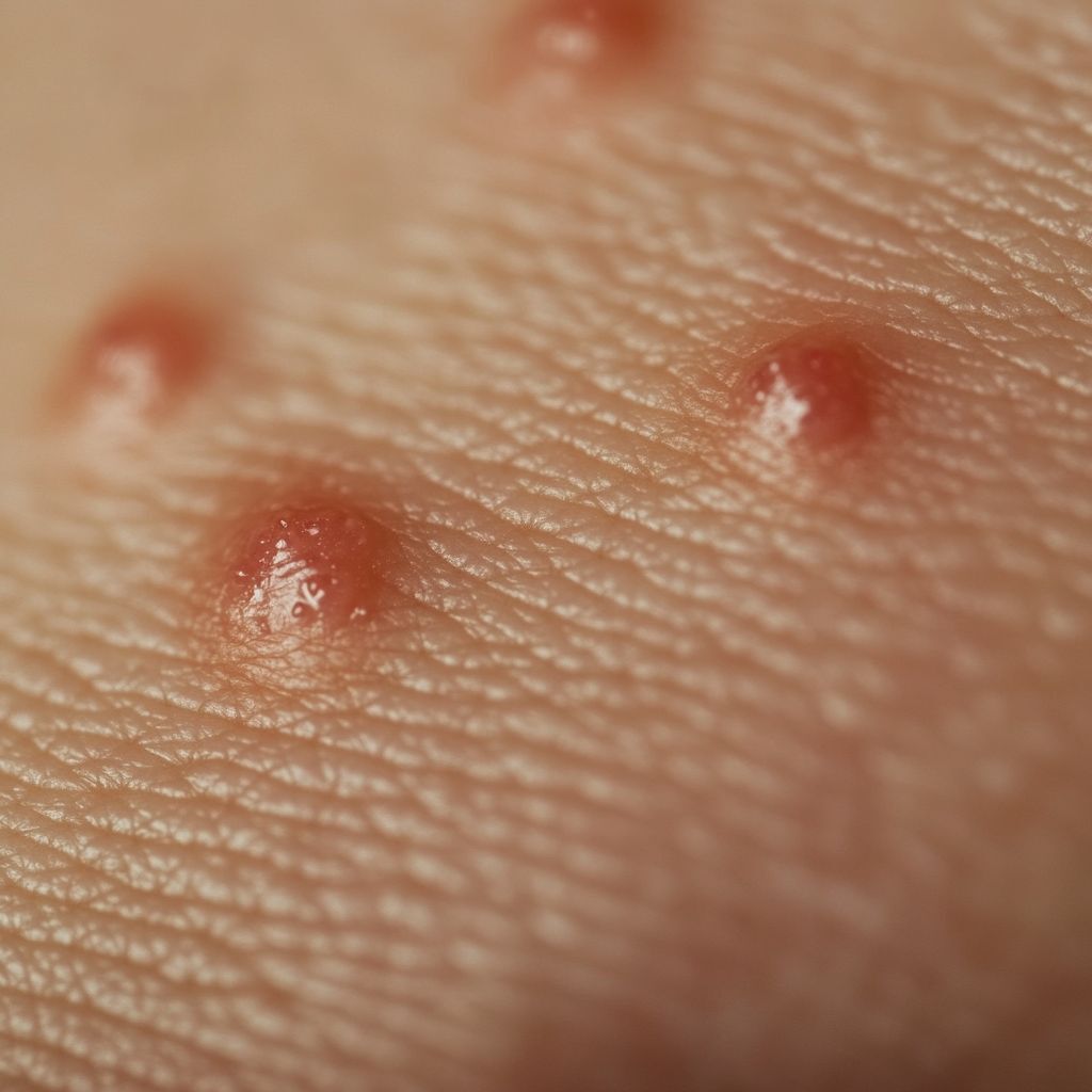 Piqûre de puce : Les puces piquent souvent en groupe ou en ligne, principalement sur les jambes, les chevilles et les pieds. Les piqûres sont petites, rouges et provoquent des démangeaisons intenses. Elles peuvent entraîner des infections secondaires si elles sont grattées.
