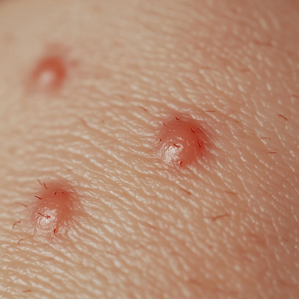 Piqûre de puce : Les puces piquent souvent en groupe ou en ligne, principalement sur les jambes, les chevilles et les pieds. Les piqûres sont petites, rouges et provoquent des démangeaisons intenses. Elles peuvent entraîner des infections secondaires si elles sont grattées.