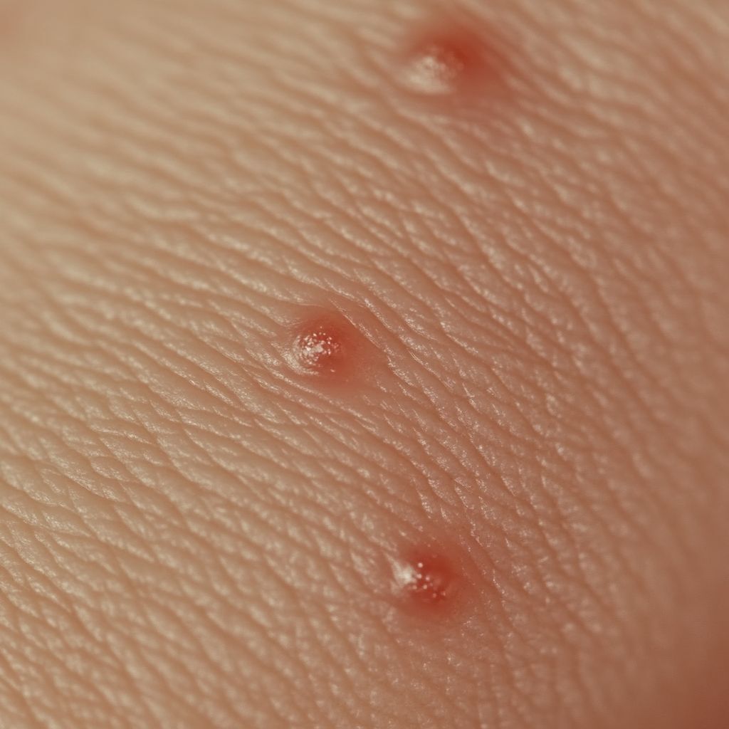 Piqûre de puce : Les puces piquent souvent en groupe ou en ligne, principalement sur les jambes, les chevilles et les pieds. Les piqûres sont petites, rouges et provoquent des démangeaisons intenses. Elles peuvent entraîner des infections secondaires si elles sont grattées.
