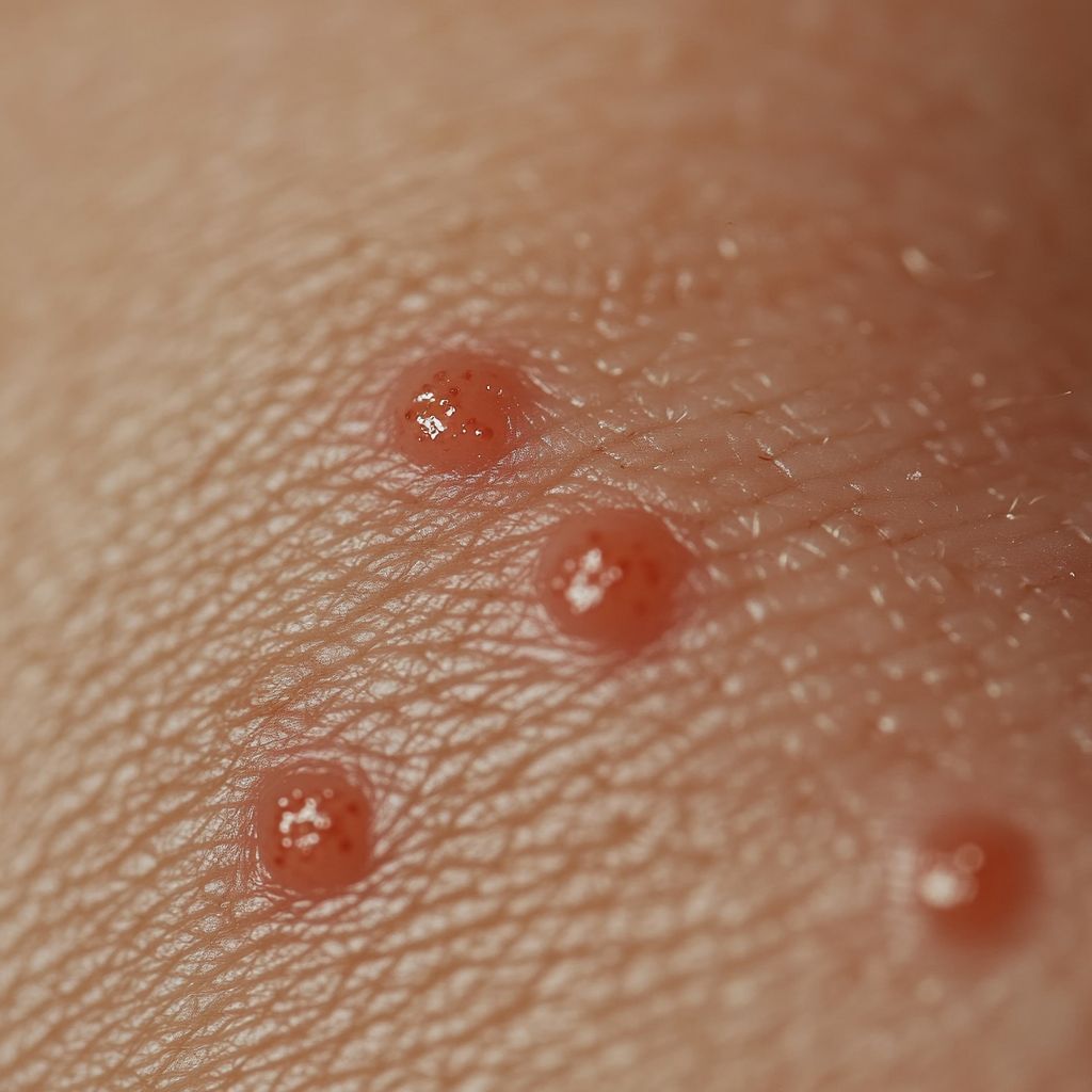 Piqûre de puce : Les puces piquent souvent en groupe ou en ligne, principalement sur les jambes, les chevilles et les pieds. Les piqûres sont petites, rouges et provoquent des démangeaisons intenses. Elles peuvent entraîner des infections secondaires si elles sont grattées.