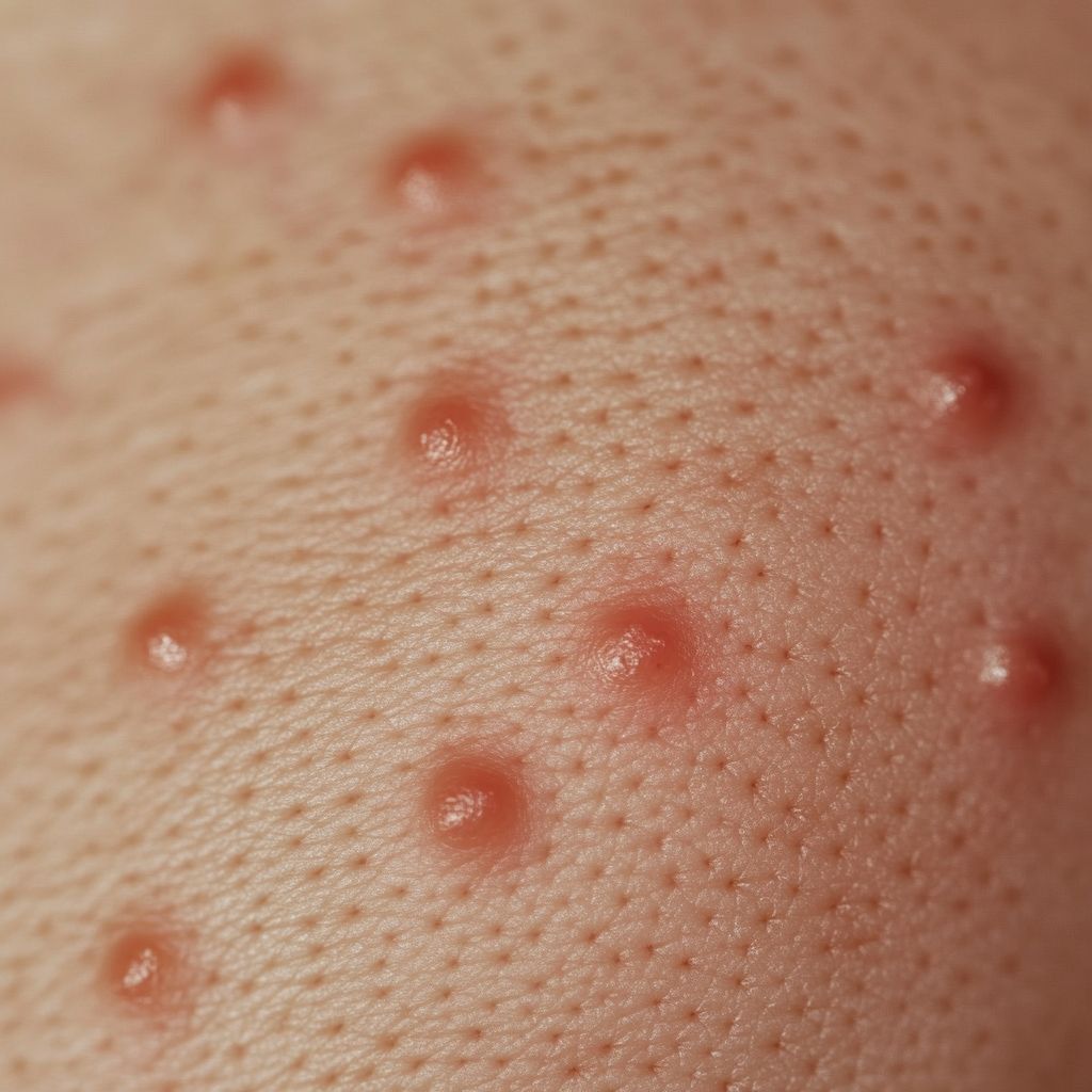 Piqûre de puce : Les puces piquent souvent en groupe ou en ligne, principalement sur les jambes, les chevilles et les pieds. Les piqûres sont petites, rouges et provoquent des démangeaisons intenses. Elles peuvent entraîner des infections secondaires si elles sont grattées.