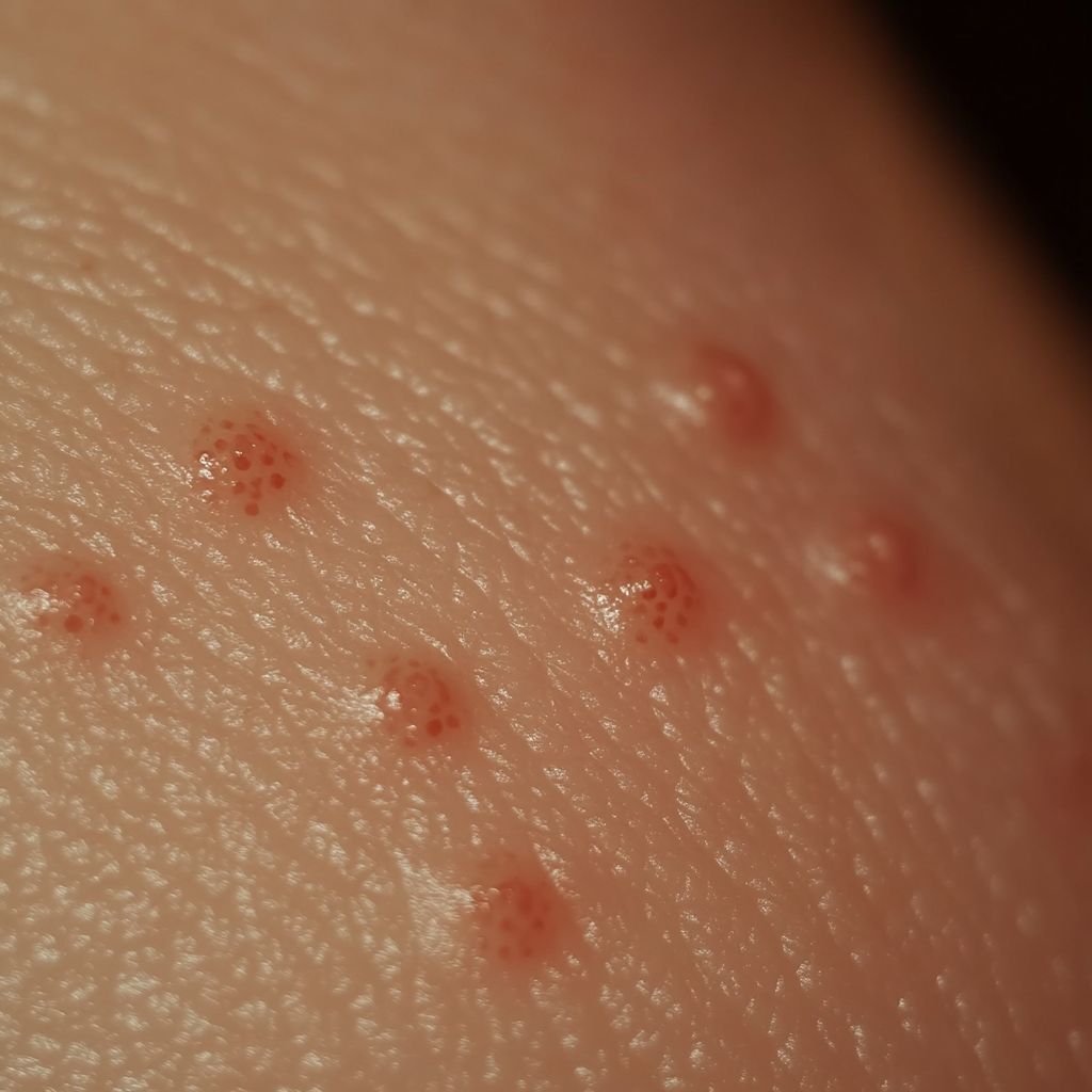 Piqûre de puce : Les puces piquent souvent en groupe ou en ligne, principalement sur les jambes, les chevilles et les pieds. Les piqûres sont petites, rouges et provoquent des démangeaisons intenses. Elles peuvent entraîner des infections secondaires si elles sont grattées.