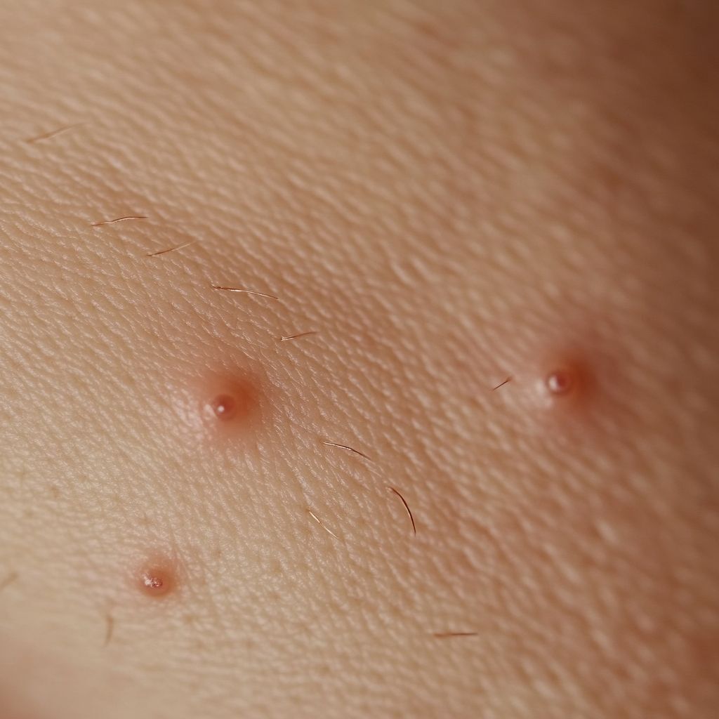 Piqûre de puce : Les puces piquent souvent en groupe ou en ligne, principalement sur les jambes, les chevilles et les pieds. Les piqûres sont petites, rouges et provoquent des démangeaisons intenses. Elles peuvent entraîner des infections secondaires si elles sont grattées.