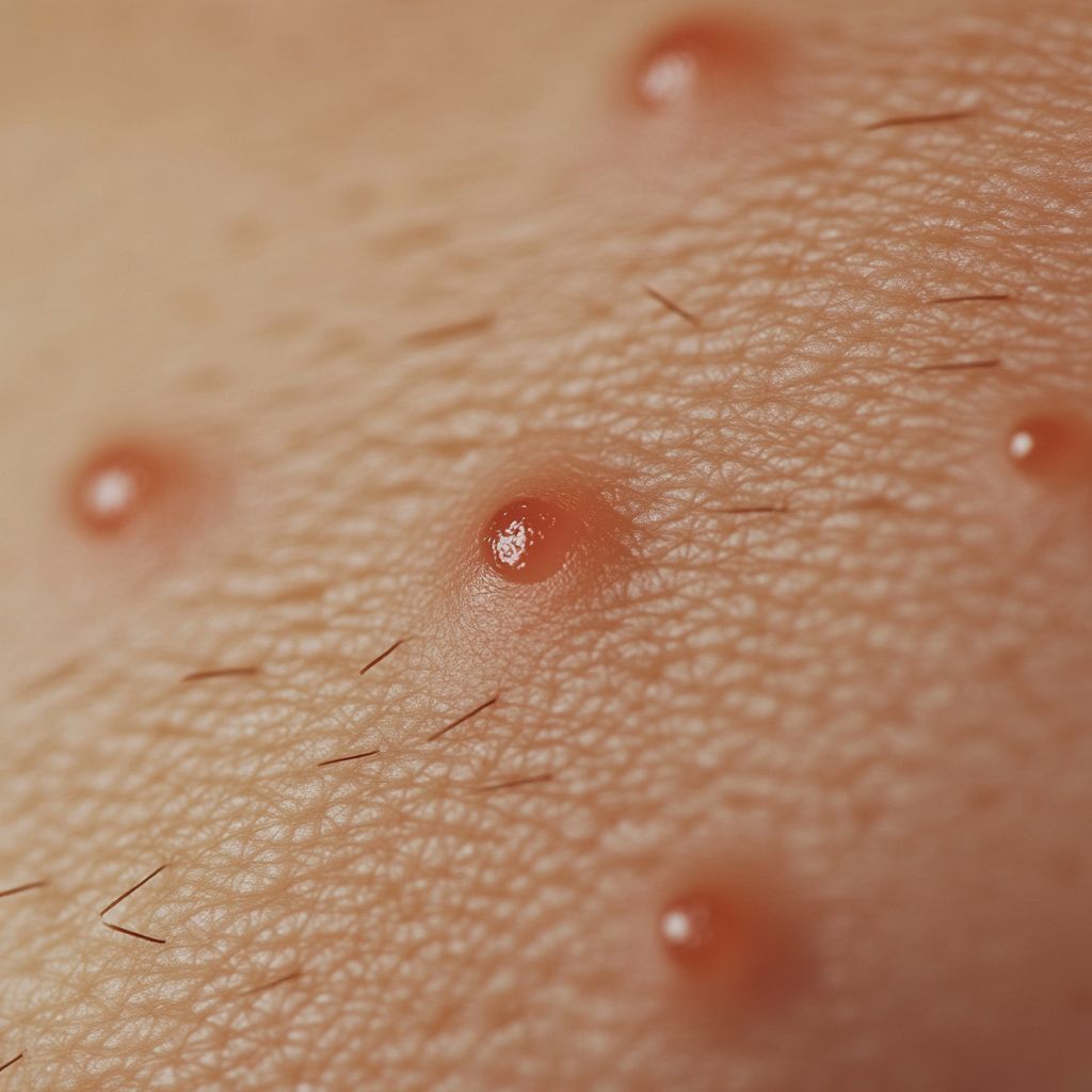 Piqûre de puce : Les puces piquent souvent en groupe ou en ligne, principalement sur les jambes, les chevilles et les pieds. Les piqûres sont petites, rouges et provoquent des démangeaisons intenses. Elles peuvent entraîner des infections secondaires si elles sont grattées.
