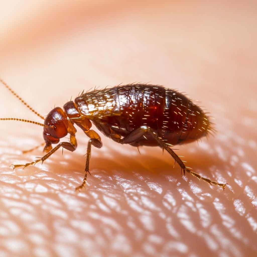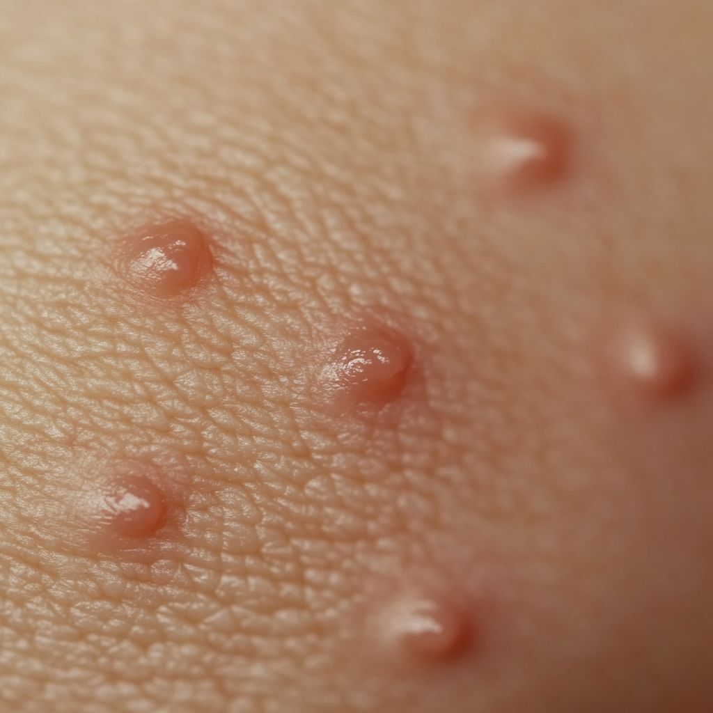 Piqûre de puce : Les puces piquent souvent en groupe ou en ligne, principalement sur les jambes, les chevilles et les pieds. Les piqûres sont petites, rouges et provoquent des démangeaisons intenses. Elles peuvent entraîner des infections secondaires si elles sont grattées.