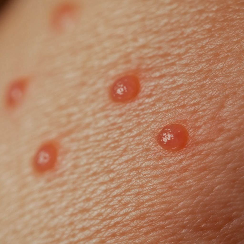 Piqûre de puce : Les puces piquent souvent en groupe ou en ligne, principalement sur les jambes, les chevilles et les pieds. Les piqûres sont petites, rouges et provoquent des démangeaisons intenses. Elles peuvent entraîner des infections secondaires si elles sont grattées.