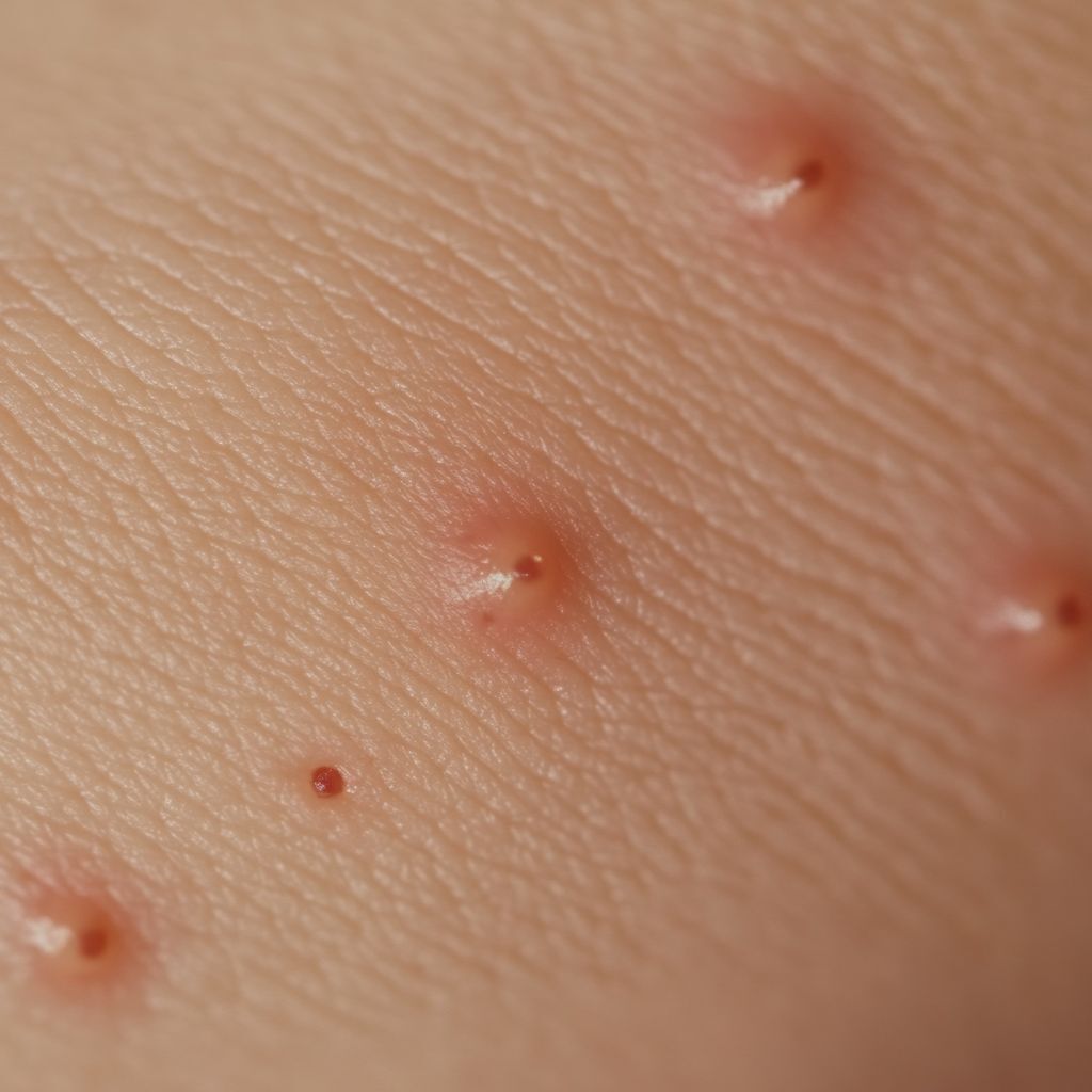 Piqûre de puce : Les puces piquent souvent en groupe ou en ligne, principalement sur les jambes, les chevilles et les pieds. Les piqûres sont petites, rouges et provoquent des démangeaisons intenses. Elles peuvent entraîner des infections secondaires si elles sont grattées.
