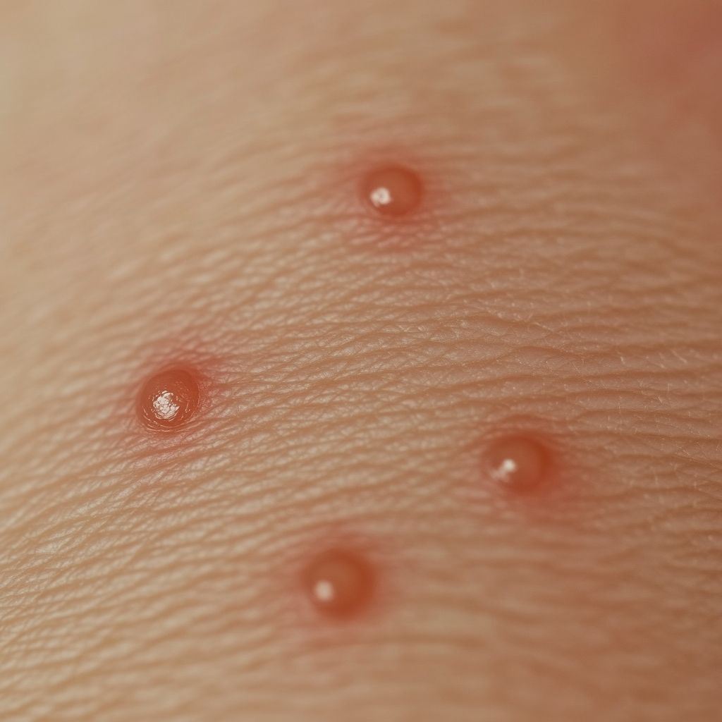 Piqûre de puce : Les puces piquent souvent en groupe ou en ligne, principalement sur les jambes, les chevilles et les pieds. Les piqûres sont petites, rouges et provoquent des démangeaisons intenses. Elles peuvent entraîner des infections secondaires si elles sont grattées.