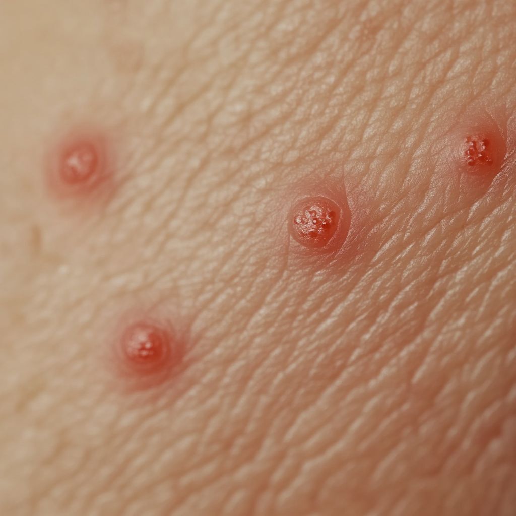 Piqûre de puce : Les puces piquent souvent en groupe ou en ligne, principalement sur les jambes, les chevilles et les pieds. Les piqûres sont petites, rouges et provoquent des démangeaisons intenses. Elles peuvent entraîner des infections secondaires si elles sont grattées.