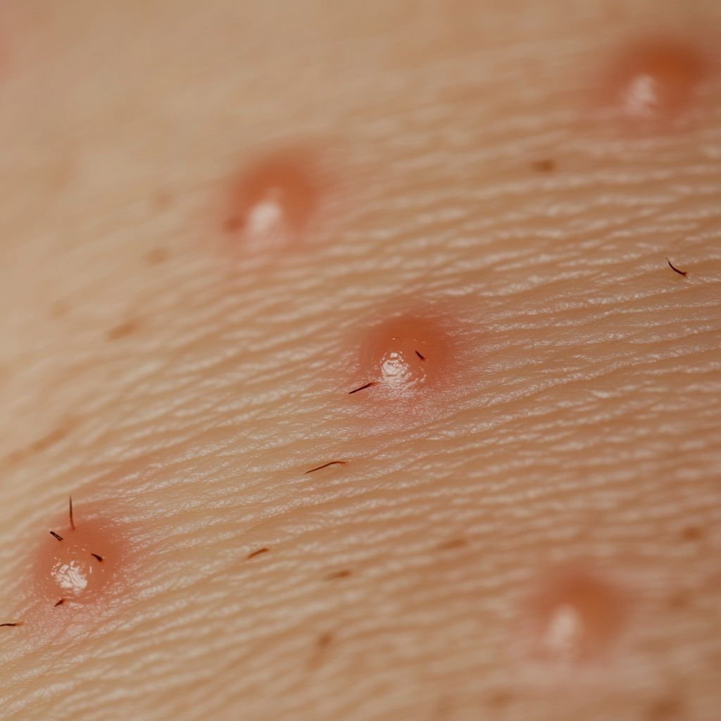 Piqûre de puce : Les puces piquent souvent en groupe ou en ligne, principalement sur les jambes, les chevilles et les pieds. Les piqûres sont petites, rouges et provoquent des démangeaisons intenses. Elles peuvent entraîner des infections secondaires si elles sont grattées.