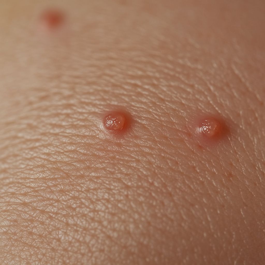 Piqûre de puce : Les puces piquent souvent en groupe ou en ligne, principalement sur les jambes, les chevilles et les pieds. Les piqûres sont petites, rouges et provoquent des démangeaisons intenses. Elles peuvent entraîner des infections secondaires si elles sont grattées.