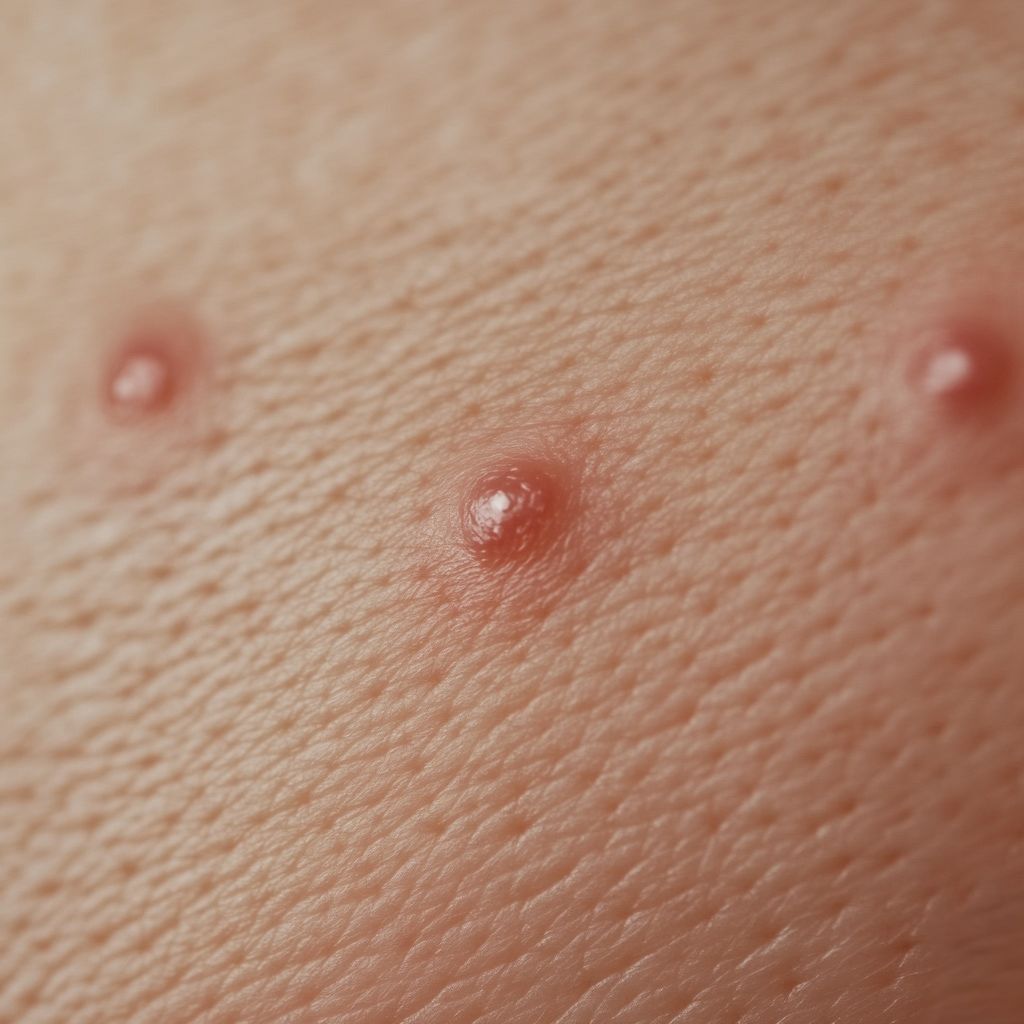 Piqûre de puce : Les puces piquent souvent en groupe ou en ligne, principalement sur les jambes, les chevilles et les pieds. Les piqûres sont petites, rouges et provoquent des démangeaisons intenses. Elles peuvent entraîner des infections secondaires si elles sont grattées.