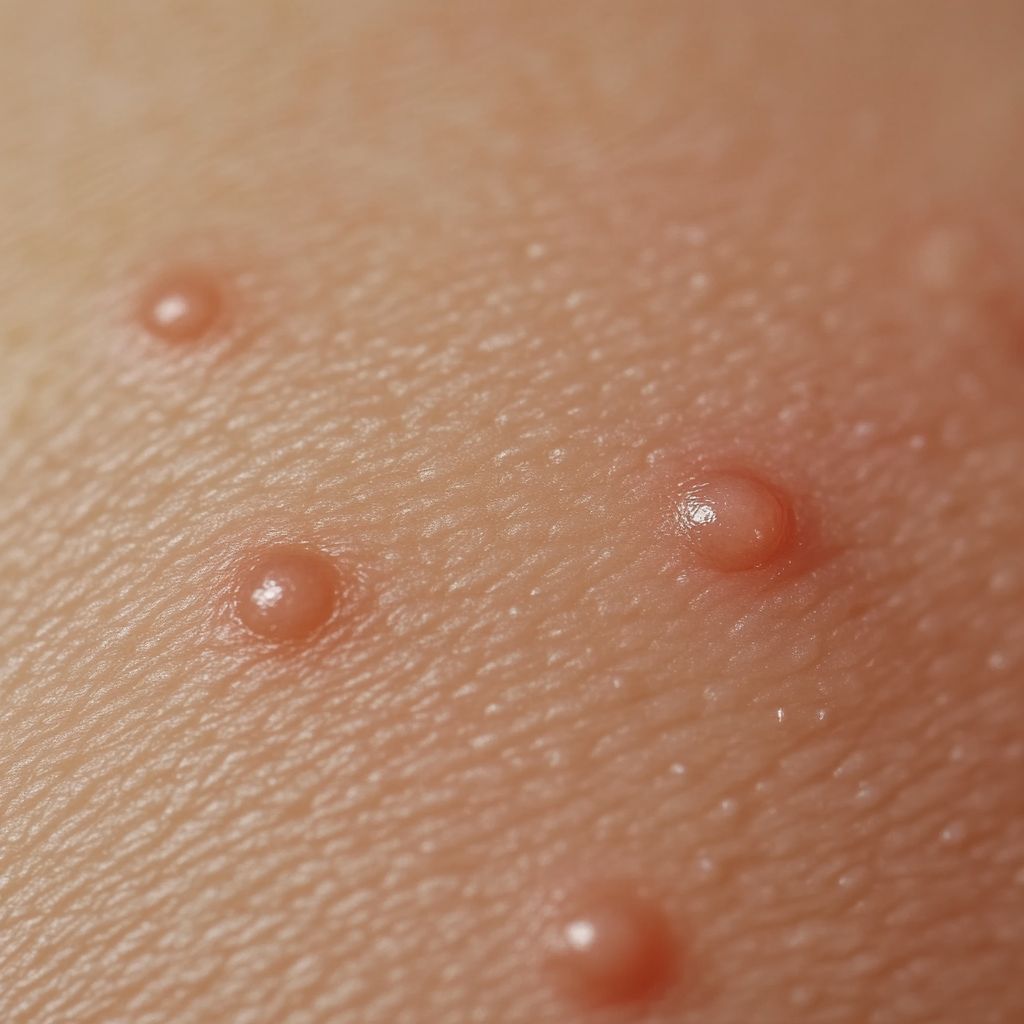 Piqûre de puce : Les puces piquent souvent en groupe ou en ligne, principalement sur les jambes, les chevilles et les pieds. Les piqûres sont petites, rouges et provoquent des démangeaisons intenses. Elles peuvent entraîner des infections secondaires si elles sont grattées.