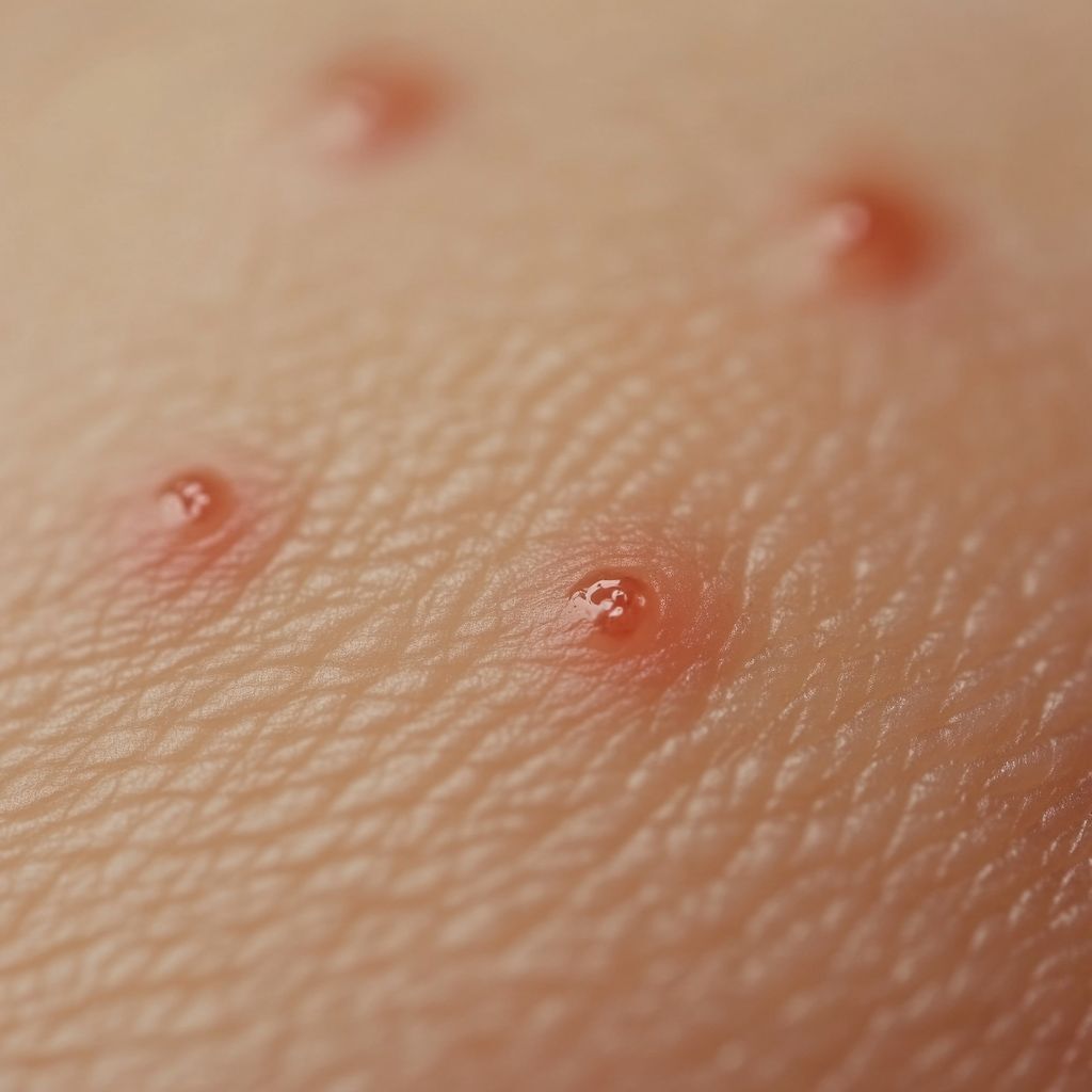 Piqûre de puce : Les puces piquent souvent en groupe ou en ligne, principalement sur les jambes, les chevilles et les pieds. Les piqûres sont petites, rouges et provoquent des démangeaisons intenses. Elles peuvent entraîner des infections secondaires si elles sont grattées.