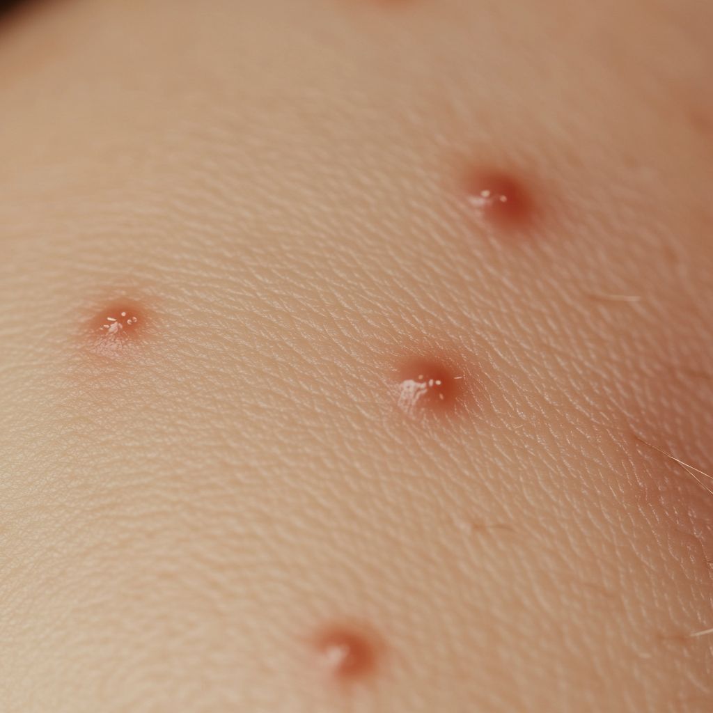 Piqûre de puce : Les puces piquent souvent en groupe ou en ligne, principalement sur les jambes, les chevilles et les pieds. Les piqûres sont petites, rouges et provoquent des démangeaisons intenses. Elles peuvent entraîner des infections secondaires si elles sont grattées.