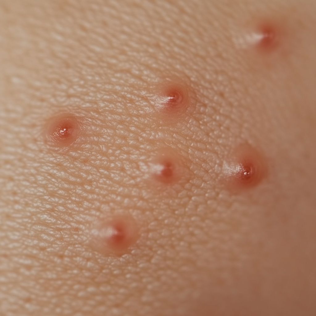 Piqûre de puce : Les puces piquent souvent en groupe ou en ligne, principalement sur les jambes, les chevilles et les pieds. Les piqûres sont petites, rouges et provoquent des démangeaisons intenses. Elles peuvent entraîner des infections secondaires si elles sont grattées.