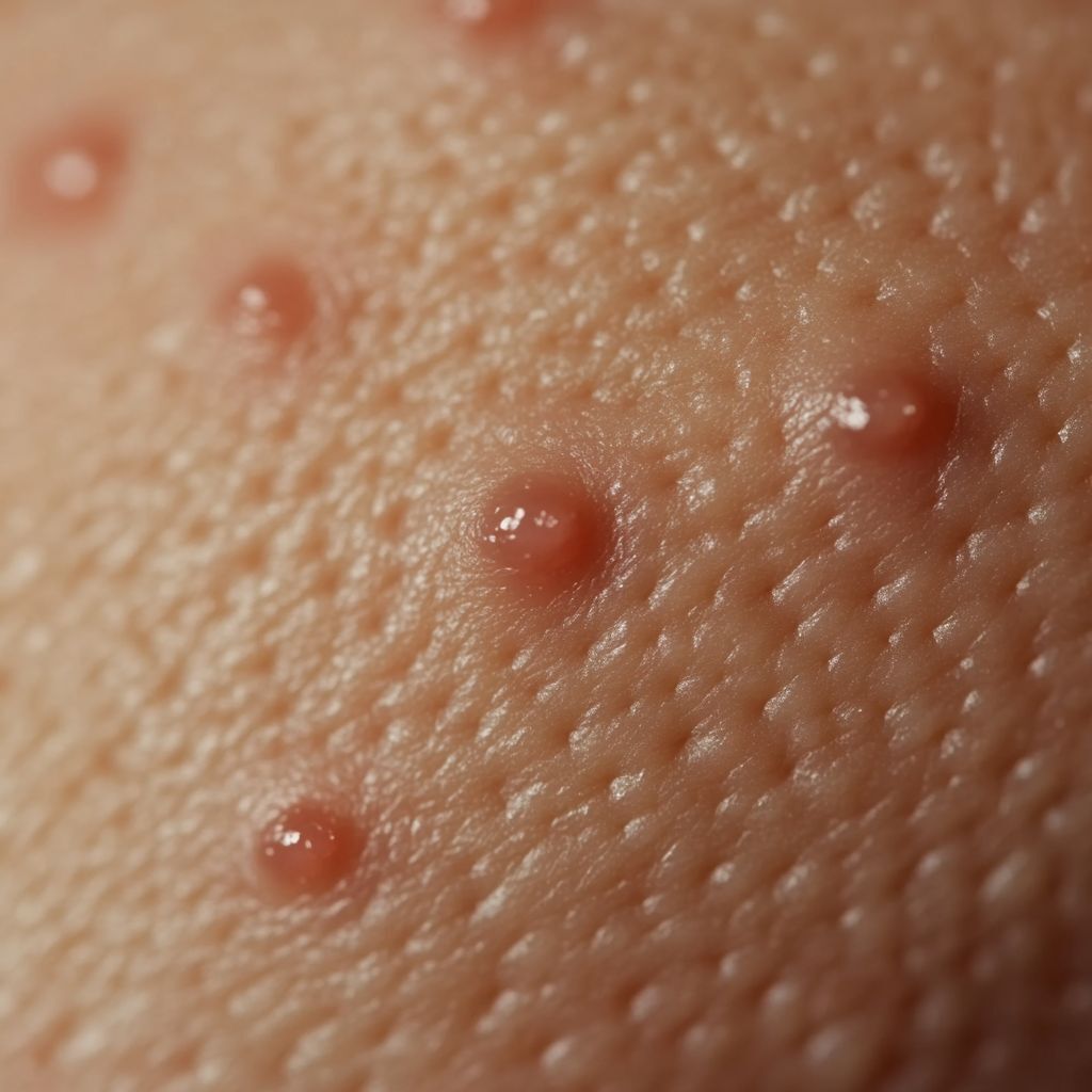 Piqûre de puce : Les puces piquent souvent en groupe ou en ligne, principalement sur les jambes, les chevilles et les pieds. Les piqûres sont petites, rouges et provoquent des démangeaisons intenses. Elles peuvent entraîner des infections secondaires si elles sont grattées.