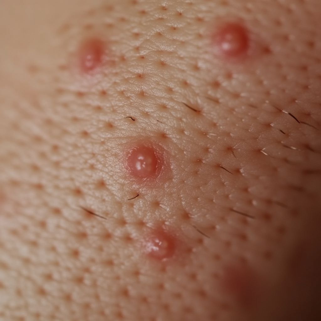Piqûre de puce : Les puces piquent souvent en groupe ou en ligne, principalement sur les jambes, les chevilles et les pieds. Les piqûres sont petites, rouges et provoquent des démangeaisons intenses. Elles peuvent entraîner des infections secondaires si elles sont grattées.