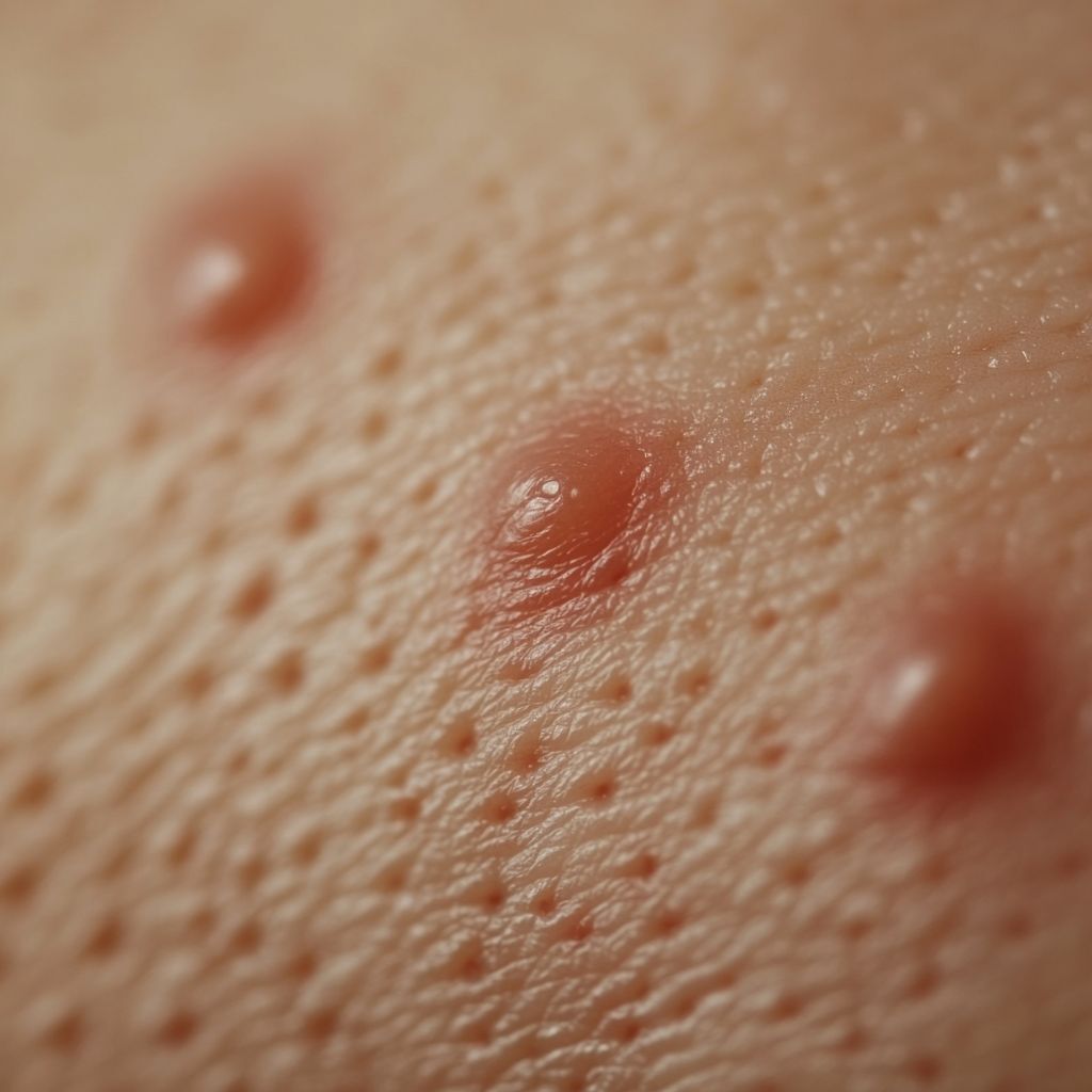 Piqûre de puce : Les puces piquent souvent en groupe ou en ligne, principalement sur les jambes, les chevilles et les pieds. Les piqûres sont petites, rouges et provoquent des démangeaisons intenses. Elles peuvent entraîner des infections secondaires si elles sont grattées.