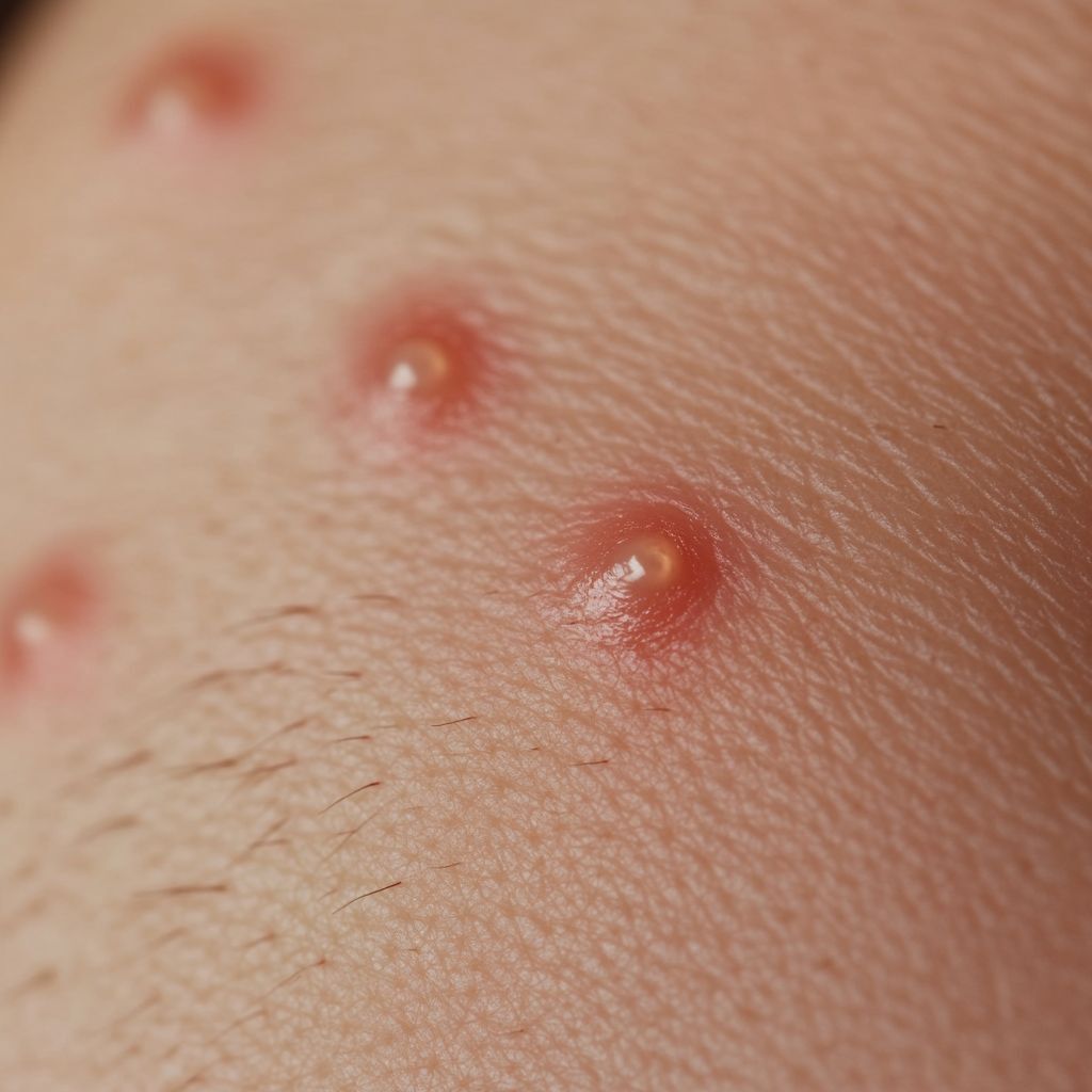 Piqûre de puce : Les puces piquent souvent en groupe ou en ligne, principalement sur les jambes, les chevilles et les pieds. Les piqûres sont petites, rouges et provoquent des démangeaisons intenses. Elles peuvent entraîner des infections secondaires si elles sont grattées.