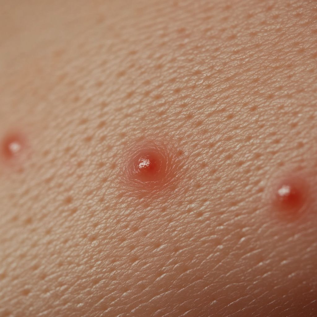 Piqûre de puce : Les puces piquent souvent en groupe ou en ligne, principalement sur les jambes, les chevilles et les pieds. Les piqûres sont petites, rouges et provoquent des démangeaisons intenses. Elles peuvent entraîner des infections secondaires si elles sont grattées.